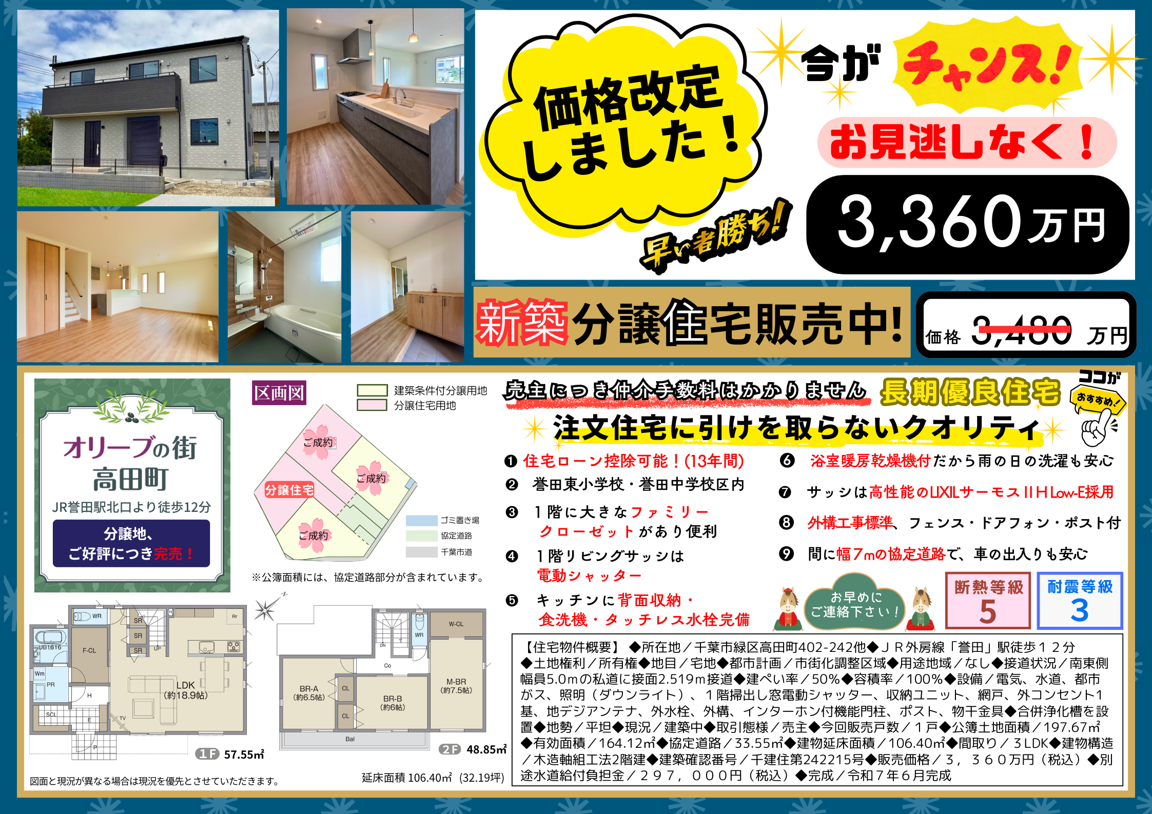 随時内覧受付中! ■耐震等級3■断熱等級5■長期優良住宅 価格改定後【価格:3,360万円】 発展目覚ましい JR外房線誉田駅北口より徒歩12分。 小学校も近く、保育所も整備され、 子育てにも優しい街です。 ✨注文住宅に […]